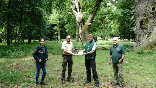 Im zweiten Anlauf konnte der Bund Deutscher Forstleute (BDF) jetzt die Auszeichnung zum Waldgebiet des Jahres an die Verantwortlichen für die Ivenacker Eichen überreichen. Das Waldgebiet liegt inmitten der Mecklenburgischen Seenplatte direkt am Ivenacker See unweit der Reuter-Stadt Stavenhagen. Bundesvorsitzender Ulrich Dohle überbrachte nun die Auszeichnung. „In diesem Wald bewahren die Forstmitarbeiter mittelalterliche Waldgeschichte, erfüllen umfangreiche Naturschutzaufgaben und machen dieses einmalige Ensemble uralter Eichen für die Bevölkerung erlebbar.“ Der Leiter des zuständigen Forstamtes Stavenhagen, Ralf Hecker, dankte für die Auszeichnung: „Ich freue mich über die Auszeichnung und sehe sie besonders als Anerkennung für das Engagement aller Mitarbeiter*innen und der beteiligten Partner*innen, ohne die wir die Projekte der letzten Jahre nicht hätten verwirklichen können.“ Die persönliche Übergabe der Auszeichnung hatte sich durch die Corona-Beschränkungen um 13 Monate verschoben. Aufgrund der besonderen Situation entschied die Forstgewerkschaft, die Auszeichnung um ein Jahr zu verlängern. „Da der Besuch des Gebietes und die Durchführung der Veranstaltungen seit einem Jahr sehr eingeschränkt waren, ist es für uns ein Gebot der Fairness die Auszeichnung für 2021 fortzuführen“, erläutert Vorsitzender Dohle die Verlängerung.