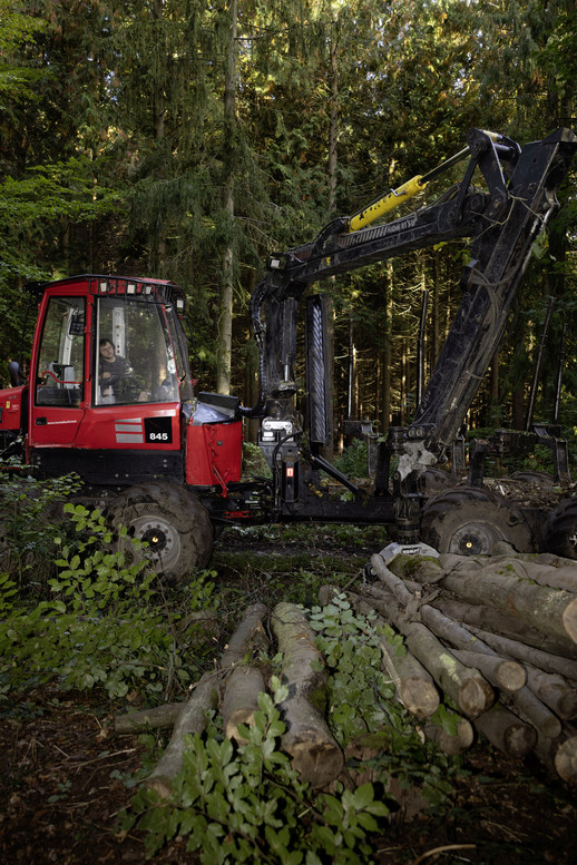 Der Holzeinschlag erfolgt zu 90 % durch Unternehmereinsatz. Ernte- und Rückearbeiten werden dabei meist an lokale Unternehmer vergeben. Bei der Holzernte sind die Vorgaben des Bodenschutzes besonders wichtig, ein 40m-Gassenabstand zwischen den Rückelinien ist Standard.